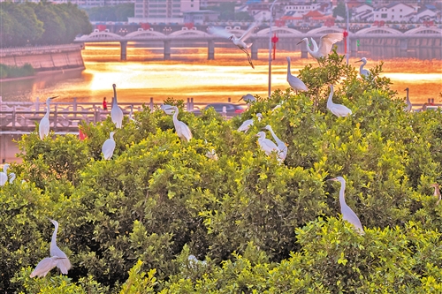 江边的榕树,是白鹭栖息的绿洲。落日照在江面一片火红,也是它们眼中的风景。