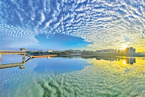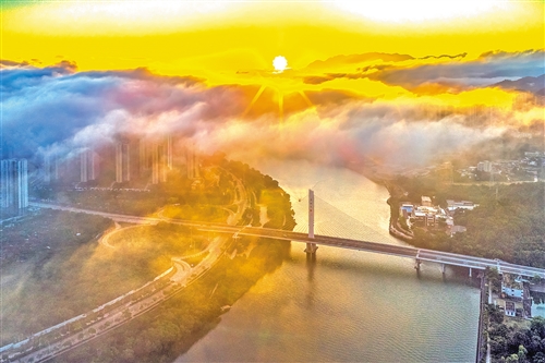 朝阳穿破云层,阳光气势磅礴地倾泻在梅江两岸。