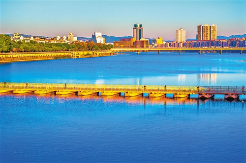 蓝色的梅江水,金黄的浮桥,宁静而美好。