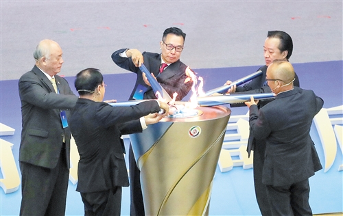 5位客商代表在世界客商中心大厅手持火炬,共同点燃主火炬。(高讯 摄)