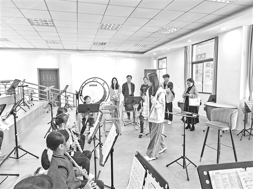 ▲星海音乐学院师生指导桂岭学校管乐团排练。(星海音乐学院供图)