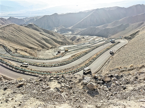 在帕米尔高原的苍茫群山中,一条如巨龙盘旋的公路蜿蜒而上,75公里浓缩600多个弯道,海拔从3000米骤升至4200米。这就是盘龙古道!在“今日走过了所有的弯路,从此人生尽是坦途”口号牌前打卡后,我们开始爬升这条网红的盘山公路。不到半个小时,车子便把我们送到了山顶停车场。沿途目及的雪峰早已吊足了我的胃口,一停车便向着山顶的观景台进发,此时脚下已是4000多米的海拔。当到达北坡下山途中的大小盘龙打卡点时发现,大盘龙观景点游人虽然很多,但大家也尽情在这里拍照。在小盘龙打卡点,除了俯瞰眼前延伸至村庄的盘山公路外,对面远山的雅丹地貌风景也很别致,千沟万壑壮观无比。