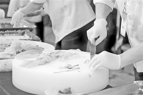 随着裁判一声令下,选手们迅速进入状态。指尖翻飞间,鱼鳞快速脱落;精准下刀时,鱼骨与鱼肉完美分离;手持薄刀切片,每一片鱼肉都薄厚均匀、纹理清晰,堪称“刀尖上的艺术”。随后,选手们将十余种配料巧妙搭配,或错落摆放、或环绕点缀,让每一份鱼生作品既具舌尖美味,又富视觉美感。