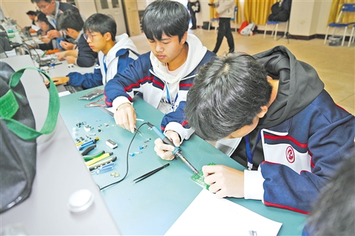 “电子产品设计与应用”项目赛场上,参赛选手正聚焦于手中的零件。(图片均由钟小丰摄)