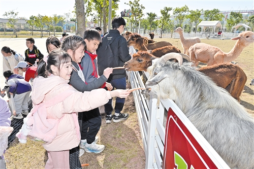 在玖崇湖动物世界,小记者们与动物亲密接触,享受欢乐时光。(钟小丰 摄)