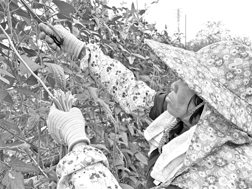 菜农采摘成熟的豇豆。(叶嘉瑶 摄)