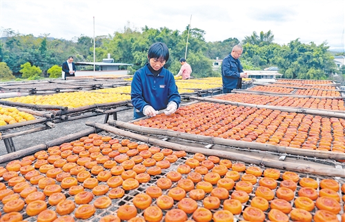 去皮的柿子均匀摊放在竹筛上摆晒、翻揉,依靠充足的阳光与通风自然风干。