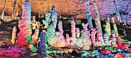 沿着蜿蜒的石径前行,首先映入眼帘的是“龙舞厅”。宽敞的洞穴内,钟乳石林立,它们形态各异,有的如翩翩起舞的仙女,身姿婀娜;有的似威风凛凛的雄狮,昂首怒吼;还有的像小巧玲珑的蘑菇,憨态可掬。这些钟乳石在灯光的映照下,闪烁着五彩斑斓的光芒,仿佛是一群精灵在举办盛大的舞会,热闹非凡。我静静地站在一旁,感受着大自然这位神奇艺术家的精湛技艺,心中不禁涌起一股敬畏之情。