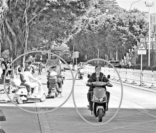 接送学生的摩托车、电动车在机动车道上逆向行驶,有些家长或学生未佩戴安全头盔。