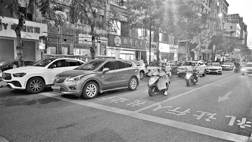 “原本是三车道,现在被违停的车占得只剩一车道能过,稍微有点会车就堵半天。”附近一住户抱怨道。记者观察发现,受违停车辆影响,该路段的车辆通行速度很低,短短百余米的路程,车辆往往需要行驶好几分钟。拥堵的交通不仅耽误了市民的出行时间,也让校门口的人流、车流交织在一起,给学生的安全带来了极大威胁。