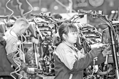 12月2日,在重庆炙焱动力制造有限公司,工人在生产线上组装出口的摩托车。
