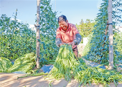 在离马山村30公里远的中行镇易智家庭农场里,曾是“丰产不丰收”的困境户易智,如今穿梭在丰收的豇豆田里,满心喜悦,这得益于华南农业大学农村科技特派员团队的精准帮扶。他们引进耐低温优质豇豆品种,并提供全程技术指导和保底收购,让易智重拾信心。“现在每天产量600至700斤,日收入最高2000多元。”易智家庭农场还带动了周边村民就业。这份“家门口的工作”,让村民赖杞兰既能日赚120元,又能照顾家庭。科技赋能让短周期、高效益的豇豆产业成为乡村振兴的新动能。