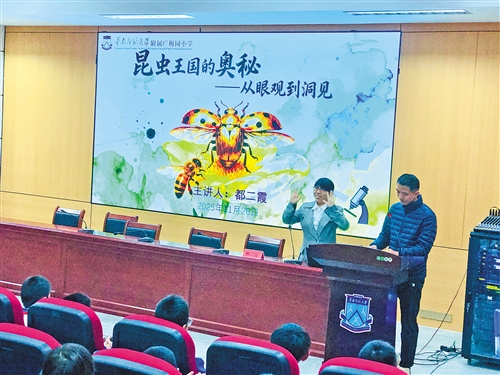 本报讯 (记者廖玉芳 通讯员黄敬桃)为持续大力弘扬科学家精神,加深青少年对自然科学的认识,引导青少年发挥好奇心、想象力和探究力以探索未知世界,近日,华南师范大学生命科学学院昆虫与技术研究所都二霞教授来到华南师范大学附属广梅园小学,以“昆虫王国探秘——从眼观到洞见”为主题,为四年级的200余名师生带来了一场丰富有趣的科普知识讲座。