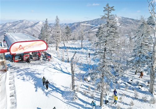 图为12月2日,在吉林市北大湖滑雪度假区,滑雪爱好者乘坐国产缆车达到山顶(无人机照片)。