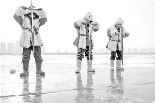 12月7日,装扮成“采冰汉子”的采冰人员在现场采冰。