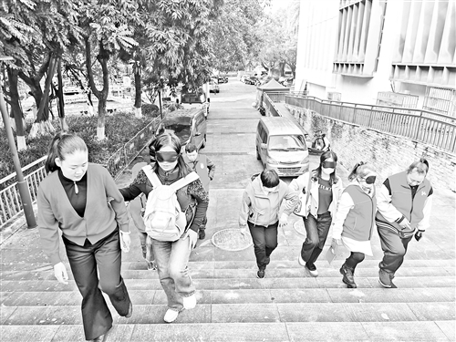 志愿者戴眼罩模拟视障出行场景。(梅州市剑英图书馆供图)
