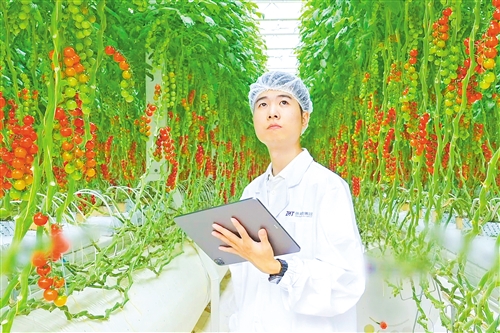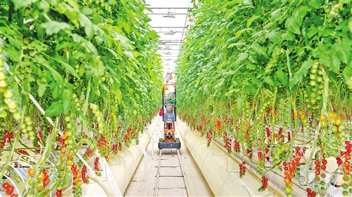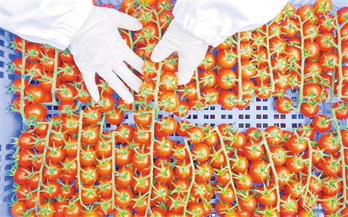 无土栽培技术展现出了显著的节水、节能、省肥、省工优势,同时高产高效,也让种植的樱桃番茄更健康。(吴锰 摄)