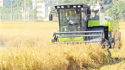在低坑村的高标准农田里,数台大型收割机穿梭田间,轰鸣声中金黄稻穗被快速收割、脱粒,饱满谷粒源源不断送入粮箱,一派丰产丰收的繁忙景象。五华县穗花香农业科技有限公司董事长范达看着眼前的丰收景象,喜悦之情溢于言表。