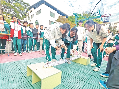 “我们始终坚持将科创思维融入各学科教学,让课堂知识在实践中得以生根发芽。”嘉应中学教师、科技劳动实践组组长许嘉志介绍说,除了每年举办一届的科技节外,该校已构建起常态化、多维度的科创活动体系,通过开展学科实验拓展、开设固定社团和兴趣班、举办实践和科普活动等形式,推动科创教育走出课堂,融入日常学习生活。这种融合模式促使学生的学习方式发生了深刻转变。该校高二学生张佳聪说:“这次制作纸桥承重作品时,运用了物理课上学的力学原理,让我真切体会到‘学以致用’的乐趣,同时也有助于我更好地掌握理论知识。”初二学生万煜城表示,参与科创实践后,自己从“被动接收知识”变为“主动探索知识”,创新思维和解决问题的能力得到显著提升。近三年来,嘉应中学科创教育成果丰硕,该校师生累计获省级奖项30多项、市级奖项150多项、区级奖项180多项,该校获评省级团体及示范学校荣誉,并孵化AI编程机器人等多个特色品牌项目。