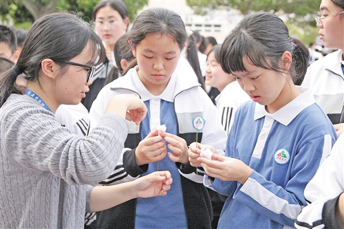学子们在体验“会变色的纸花”项目。(吴海清 摄)