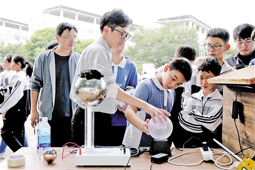 学子们在体验“静电辉光球”项目。(吴海清 摄)