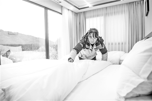 12月13日,工作人员在“冷水风谷休闲度假营地”内整理住宿客房。