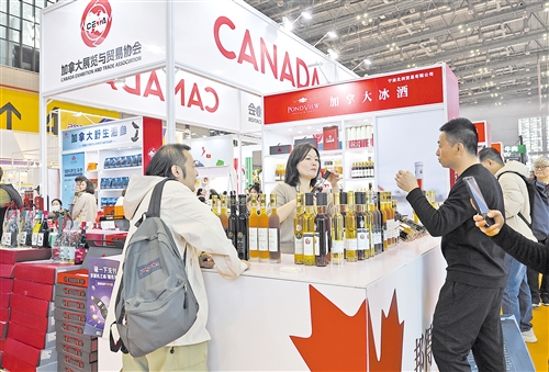 12月19日,参观者在加拿大商品展台前与工作人员交流。