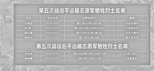 1950年12月10日,在“黄草岭战役”中,平远籍战士张仅光不幸被敌人炮弹击中,壮烈牺牲——他是平远籍志愿军赴朝作战牺牲的第一人。至抗美援朝战争结束,全县共有 20 名志愿军战士血洒疆场,他们的名字永载平远史册:谢再光、姚权卿、张仅光、张光伍、黄远福、林桂如(林贵)、马增连、刘远芳(刘元芳)、陈福安(陈佛恩)、李云松(李运松)、赖继善、韩冠禄、钟添元(钟水妹)、凌北昌(凌庆珍)、韩安德(洪伟昌)、李伟彬、林双喜、刘阿介、林铭昌(林闽昌)、李金钟。每一个名字背后,都是一段“舍生取义”的英雄故事;每一次牺牲,都为“保家卫国”的信念注入滚烫的热血。