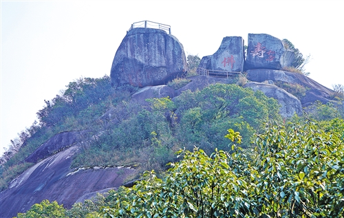 从寺后茶园再度进入森林,向前一公里,即抵王寿山主峰——海拔1148米的棋盘石。巨石顶部平坦如棋盘,上刻棋格,相传八仙曾在此对弈。铁拐李因输棋怒劈巨石,至今石上橙红苔痕似当年“血迹”,裂石上分别刻有“佛”“寿”及“仁者”数字,似在暗喻长寿真谛。抚过斑驳的八仙宫与天坛宝库外壁,仿佛可见仙踪隐隐。山顶怪石嶙峋,有如巨兽张口,又有若螳螂悬壁,栩栩如生。立于山巅,四周原始林海苍翠起伏,棉花滩龙湖碧波如翡翠镶嵌群山之间;笠麻岽形如客家斗笠,蜡烛台孤耸如柱……昔日这里曾是烽火瞭望台,如今则是绝美观景台,梅州、大埔、蕉岭、上杭、永定等五县山川田园,尽收眼底。