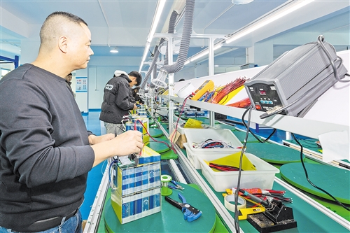 领跑科技生产车间内,工人正在有序进行组装、检测等各项工序。(连志城 摄)