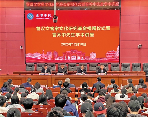 本报讯 (记者吴海清)12月18日下午,管汉文客家文化研究基金捐赠仪式暨管乔中先生学术讲座活动在嘉应学院举行。广东凯普生物科技股份有限公司董事长、韩山书院山长管乔中,韩山书院副山长赵松元,嘉应学院党委书记陈文海、副校长罗嘉文、廖志成等领导嘉宾共300余人齐聚现场,共同见证“管汉文客家文化基金”100万元专项基金落地,共话客家文化传承创新。