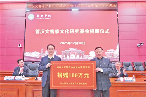据悉,在嘉应学院的教育发展基金内创设的“管汉文客家文化基金”是由祖籍大埔的梅州贤达管乔中以其祖父管汉文名讳为名设立的,该基金的设立源于今年11月管乔中参加第七届世界客商大会期间,他与嘉应学院达成的交流共识。此次他为嘉应学院捐赠的100万元,将专款用于资助客家文化研究。