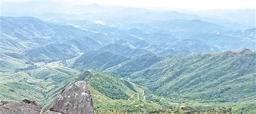 不知走了多久,当耳边传来其他游客的欢呼时,我们终于登上了顶峰!那一刻,所有的疲惫都被山顶的壮阔瞬间冲散。站在观景台上极目远眺,闽粤赣三省的风光尽收眼底:连绵起伏的山峦层层叠叠,丘陵地带塑料薄膜覆盖的脐橙园,在云雾中若隐若现,宛如一幅徐徐展开的水墨长卷;远处的村庄星星点点,在阳光下泛着温暖的光;山风呼啸而过,带着山间的清凉,吹走了所有的烦恼与浮躁。