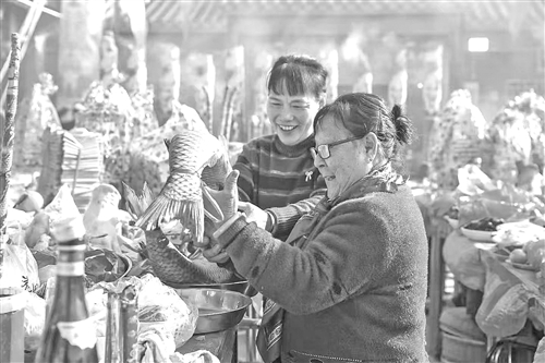 穿戴整齐参加还福祭祀的众亲。 村民摆上祭品鱼,寓意年年有余。 还福场面 还福祭品丰富,仪式结束后,村民用畲箩挑着祭品回家。 1月2日,大埔县百侯镇侯北村举行一年一度的还福活动。村民抬着全猪、全羊,备好牲礼果品金锭,齐聚鸳鸯祠广场。主祭人领诵经文,众人祷告祈福,酬神还愿,庆贺过去一年国泰民安、五谷丰登、六畜兴旺,祈求新的一年风调雨顺、身体健康、合家幸福。民俗体现了村民对自然的敬畏、对神灵的敬仰和对生活的热爱。这一民俗活动据说已延续了七百多年。(罗金星/文、摄)