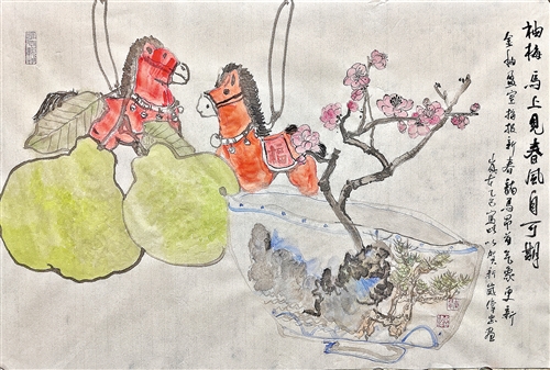 ▲《天佑吉祥》 138x68cm 张千凌 ▲《牡丹倾国绽芳姿》240x120cm 钟育辉 ▲《田园清梦》138x68cm 梁艺君 ▲《玉魂冰心》180x97cm 张海帆 ▲《翠幄藏金》138x68cm 徐星球 ▲《劝君记得到梅州》138x68cm 张洪光 ▲《宫粉梅报春》138x68cm 侯增鑫 ▲《金风满枝头》138x69cm 李启志 ▲ 《铁骨生春》180x97cm 徐丽霞 ▲《古梅之韵》180x90cm 徐达文 ▲《金玉满堂柚团圆》68x45cm 李名辉 ▲《柚果飘香》180x143cm 叶春香 ▲《柚香伴岁寒》138x68cm 张杰 ▲《有梅马上见 春风自可期》68x45cm 陈伟忠 ▲《客乡满地黄》180x97cm 王映珍 ▲《家家喜收致富果》 136x68cm 曹仕军 ▲《疏枝金柚盈客村》138x69cm 潘小梅 编者按 岁序更迭,万象更新。当元旦的钟声余韵未绝,新春的脚步已悄然临近。在这辞旧迎新的交汇点,梅州日报副刊部与梅州市中国画学会携手策划,共同推出这一方墨彩交融的作品专版,以艺术之名,迎接又一个春天的到来。 笔墨紧随时代,丹青寄托乡情。梅州市中国画学会的会员们深入田间地头,行走山川野外,将身心融入客乡大地。他们以笔为舟,以墨为帆,描摹的是客家山水的灵秀俊朗,记录的是梅花、金柚的生机盎然。尺幅之间,既有“江山如此多娇”的宏阔气象,也见“万物生光辉”的细腻温情。一笔一划,勾勒的是脚下土地的厚重;一染一皴,晕开的是心中家园的眷恋。 旧岁已展千重锦,新年再登百步楼。愿这一幅幅饱含温度与生命力的作品,能带领读者穿越纸墨,触摸到客都山水的脉搏,感受到新年奋进的节奏,共同见证——这片土地上,春光正好,未来可期。