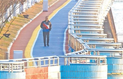 ▲梅城市民沿江奔跑,夕阳下整齐的护栏闪耀着金属光泽。