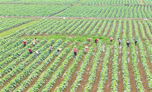 ▲大埔县高陂镇古东村,烟田里一片繁忙景象。