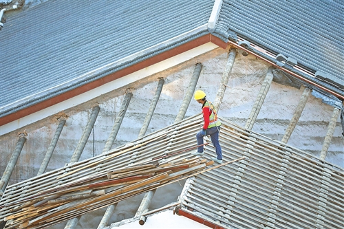 ▲嘉应古城历史文化街区保护提升项目,工人在屋顶工作。