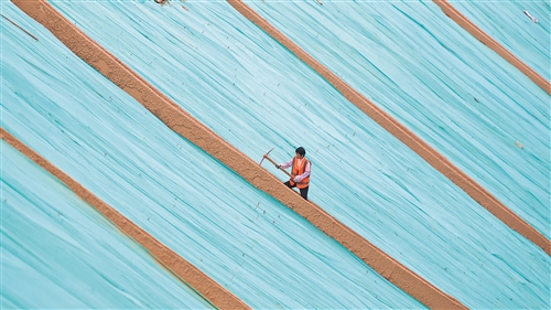 屋顶瓦垄纵横,工人俯身铲除旧瓦,勾勒出劳作的剪影;护坡施工现场,反光背心的亮色在线条分明的坡面跃动,定格建设的瞬间。江畔步道线条蜿蜒,市民奔跑的身影,让寻常日子也溢满活力。