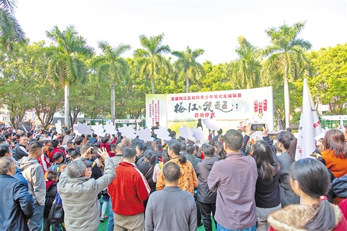 赛事创新模式获得足球界专业人士高度认可。梅州籍前国脚黄德保表示,笼式足球场地小的特点特别适合幼儿和小学生练习基本功,对培养足球兴趣、推动梅江区足球发展大有裨益。“足球实战的关键是在最小空间内高效解决问题,笼式足球恰好聚焦这一核心。”梅州籍前国脚李海强认为,这种模式能打磨青少年在紧凑环境下的配合、过人、射门技巧,实现足球运动的全民适配,让不同年龄段人群都能享受运动乐趣。广东省足协副主席、著名教练员周穗安更是称赞:“这是足球与艺术的绝佳融合,让孩子在享受足球快乐的同时接受国学熏陶,是推动青少年全面发展的积极探索。”