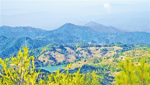 在山顶远眺,碧蓝的天空,层叠的群山,清澈的湖水以及起伏的茶田。