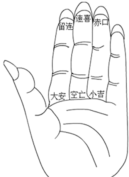?掐指起卦的方法是:伸出左手,以食指、中指、无名指这三根指的指根、指尖为节点,共六个节点,围成一圈(如图①)。以食指根为起始点,依顺时针方向命名,吉凶相间,分别是大安、留连、速喜、赤口、小吉、空亡。当遇事需测凶吉时,便以大安为起点,顺时针掐转,先掐月,由一月直至当月,落于某节点;再以月的落点为起点掐日,由初一直至当日;最后以日的落点为起点掐时,由子时(数字1)直到当时。最终以时的落点的凶吉来确定事态。例如,求测“十月八日辰时”起事的凶吉,先从大安起为正月,顺数至十月落于赤口;再从赤口起为初一,顺数至初八落于小吉;最后从小吉起为子时,顺数至辰时(字数5)落于速喜。以时辰卦象为最终结果,此“速喜”为吉的卦象。