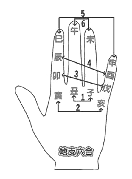 算命先生把十二地支排布于左手(除拇指外)的各个指点(如图②),横向组合为“合”。经此排布,通过掐指就方便直观判断合或冲,即判断吉或凶。