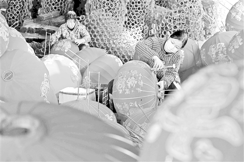 1月15日,工人在石家庄市藁城区屯头村一家宫灯厂制作宫灯。