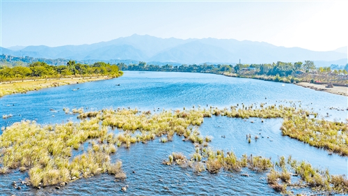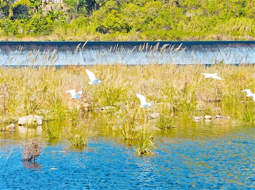 冬日暖阳下,清澈的石窟河水波光粼粼,浅滩处三五只白鹭低头觅食,另外几只白鹭则张开翅膀在空中盘旋,因这里环境优美生态优良,它们已经在这里安家落户繁衍生息。