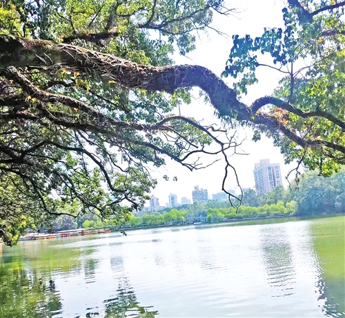 走进福州西湖公园,古树遮天蔽日,湖水绿如翡翠,给人一种清凉静谧的感觉。