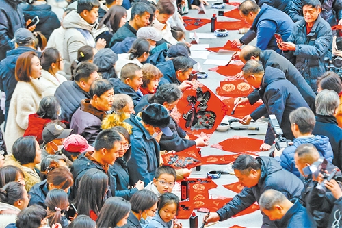 1月22日,文艺工作者在天津市滨海文化中心为市民现场书写春联和“福”字。 春节临近,年味渐浓。各地举办年货大集、写福字春联等活动,人们选购鲜花、中国结等饰物,迎接新春。 (新华社发)