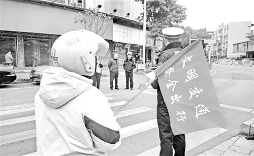 轻微交通违法行为人“秒变”文明交通劝导员,在“角色转换”中体会遵守交通法规的重要性。(陈坚平 摄)