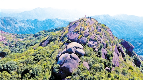 登临1256米的西岩主峰,极目远眺,峰峦叠翠,层林尽染。枫朗、百侯、湖寮三镇的楼宇村舍隐约可见;大潮高速如灰白游龙穿行于群山之间;饶平水库波光潋滟;茶山梯田曲线婉转……天与山交织出深绿、浅绿、蓝绿、淡蓝、蓝紫等丰富而和谐的色调,令人心旷神怡。
