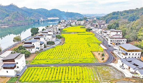 本报讯 (记者张莹娜 实习生李凤泊)冬日暖阳下,梅江区长沙镇澄滩村种植的50亩油菜花迎来盛花期,金灿灿的花浪随风起伏,溢彩流香。这片由撂荒土地集约改造而成的景观农田,与周边农房相映成趣,勾勒出一幅秀美的乡村画卷,吸引众多市民游客慕名前来赏花游玩。